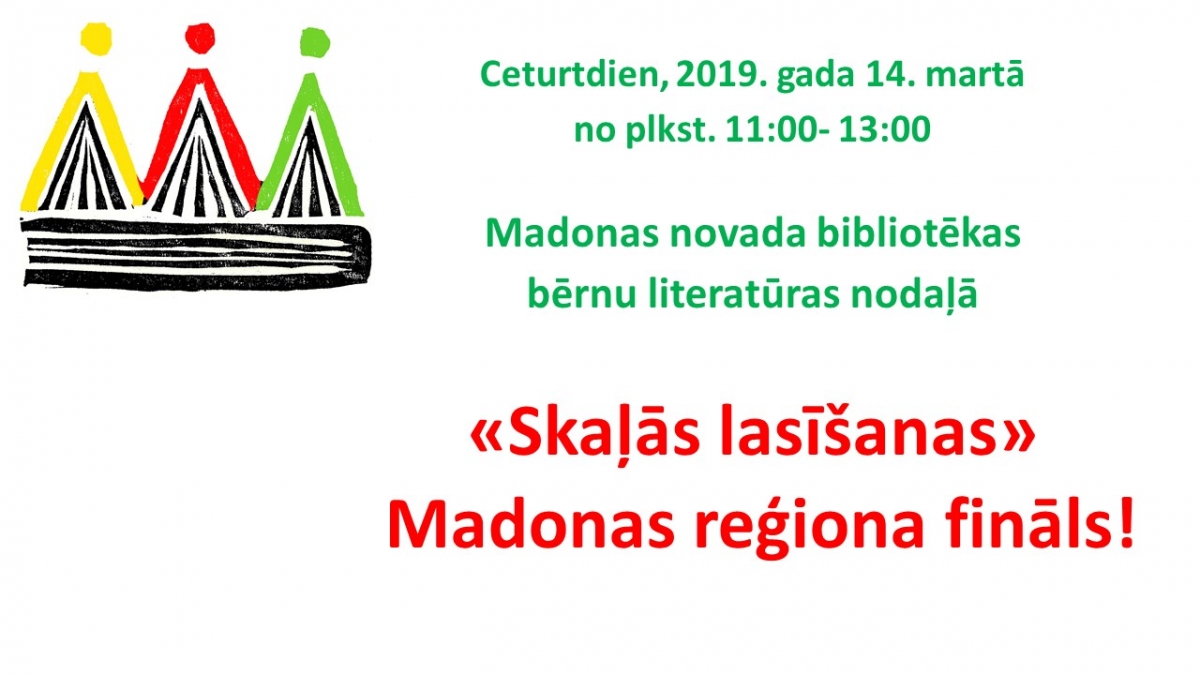 Ceturtdien, 2019. gada 14. martā no 11:00 līdz 13:00 Madonas novada bibliotēkas Bērnu literatūras nodaļā «Skaļās lasīšanas» Madonas reģiona fināls!