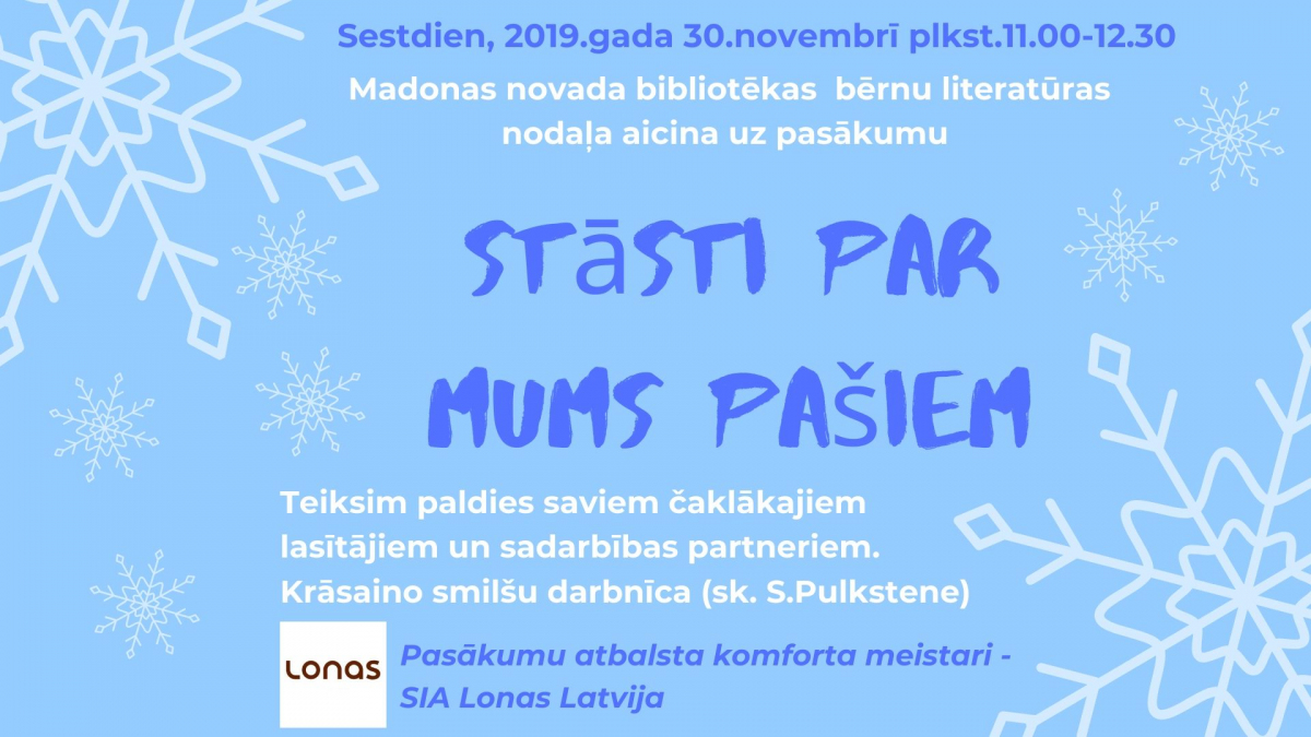 30. novembrī plkst. 11:00- 12:30 aicinām uz šī gada pasākumu cikla “Stāsti par mums pašiem” noslēdzošo nodarbību. Teiksim “paldies” aktīvākajām ģimenēm un ilggadējiem sadarbības partneriem.