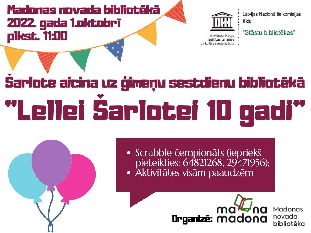Lelle Šarlote, kas jau 10 gadus Madonas novada bibliotēkas bērnu literatūras nodaļā  kopā ar bērniem  iepazīst pasauli un lietas, veicina lasītprieku un iepriecina visu paaudžu apmeklētājus, aicina visus  draugus uz savu 10. dzimšanas dienu.