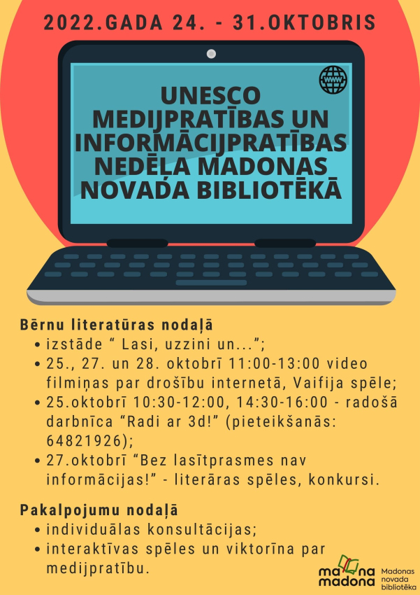 Šogad jau vienpadsmito gadu no 24. līdz 31. oktobrim visā pasaulē tiks atzīmēta UNESCO medijpratības un informācijpratības nedēļa, kuras gaitā tiek izcelti tādi jautājumi kā lasītprasme, pieeja kvalitatīvai informācijai un cīņa pret dezinformāciju. Arī Madonas novada bibliotēka visu nedēļu saviem apmeklētājiem piedāvās dažādas aktivitātes.