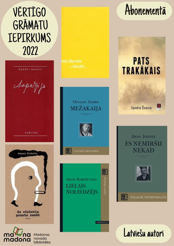 Madonas novada bibliotēkas jauno grāmatu piedāvājums novembrī, tajā skaitā LNB Bibliotēku attīstības centra "Vērtīgo grāmatu iepirkuma 2022" otrais grāmatu pievedums.