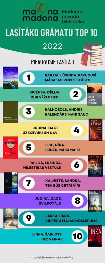 Kopumā 2022. gadā Madonas novada bibliotēkā reģistrēti 2350 lasītāji, kuri lasījuši uz vietas vai izdevumus ņēmuši līdzi uz mājām. Lai vai kā, radīts kopīgais izsniegums – 47551 izdevumi.