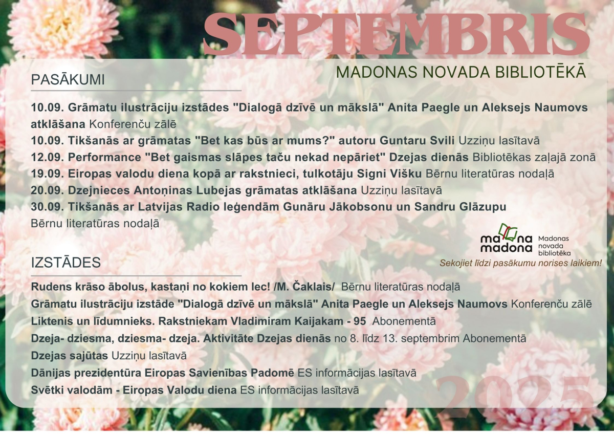 Iepazīsties ar plašo piedāvājumu septembrī! Seko līdzi aktivitāšu un norišu laikiem, lai sevis izvēlētajā notikumā varētu būt klātesošs pie mums bibliotēkā! Tiekamies rudenī!