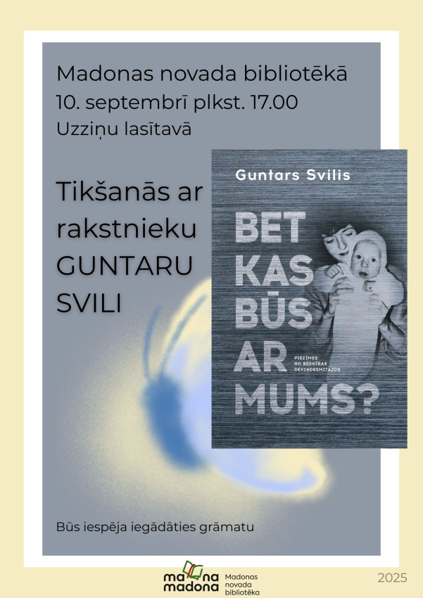 Rakstnieks Guntars Svilis nu pazīstams kā romāna autors, kurā caurvijas dzīves pieredze, vēsturiskas norises un cilvēku likteņu daudzbalsība. Tikšanās solās būt interesanta, jo grāmatas “Bet kas būs ar mums?” notikumi ir tieši Madonā. Būs aizraujoši gan literatūras cienītājiem, gan ikvienam, kuru saista rakstniecības aizkulises.