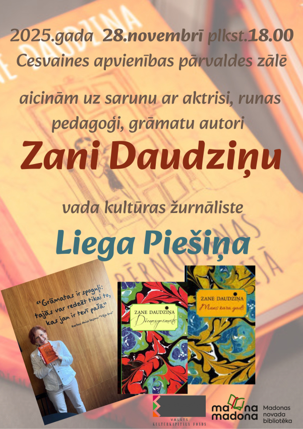 - novembrī plkst. 18.00 Cesvaines apvienības pārvaldes zālē ikviens interesents laipni aicināts uz sarunu ar aktrisi, runas pedagoģi un grāmatu autori Zani Daudziņu. Sarunu vadīs kultūras žurnāliste Liega Piešiņa.