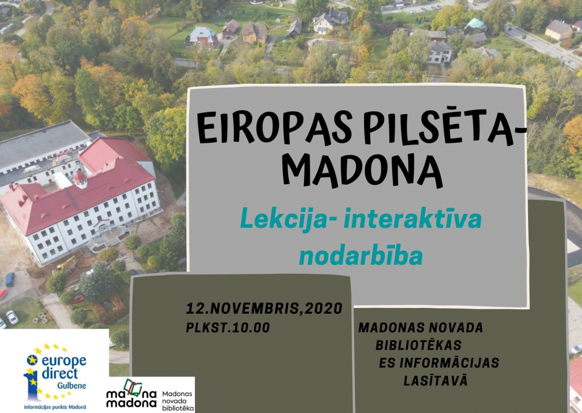 Madonas bibliotēkā ES Uzziņu lasītavā 12.novembrī notiks interaktīva nodarbība "Eiropas pilsēta- Madona". Uzziņu lasītavas apmeklētāji varēs pārbaudīt savas zināšanas par Madonas vēsturi, ģeogrāfiju un ES fondu īstenotajiem projektiem pilsētā.