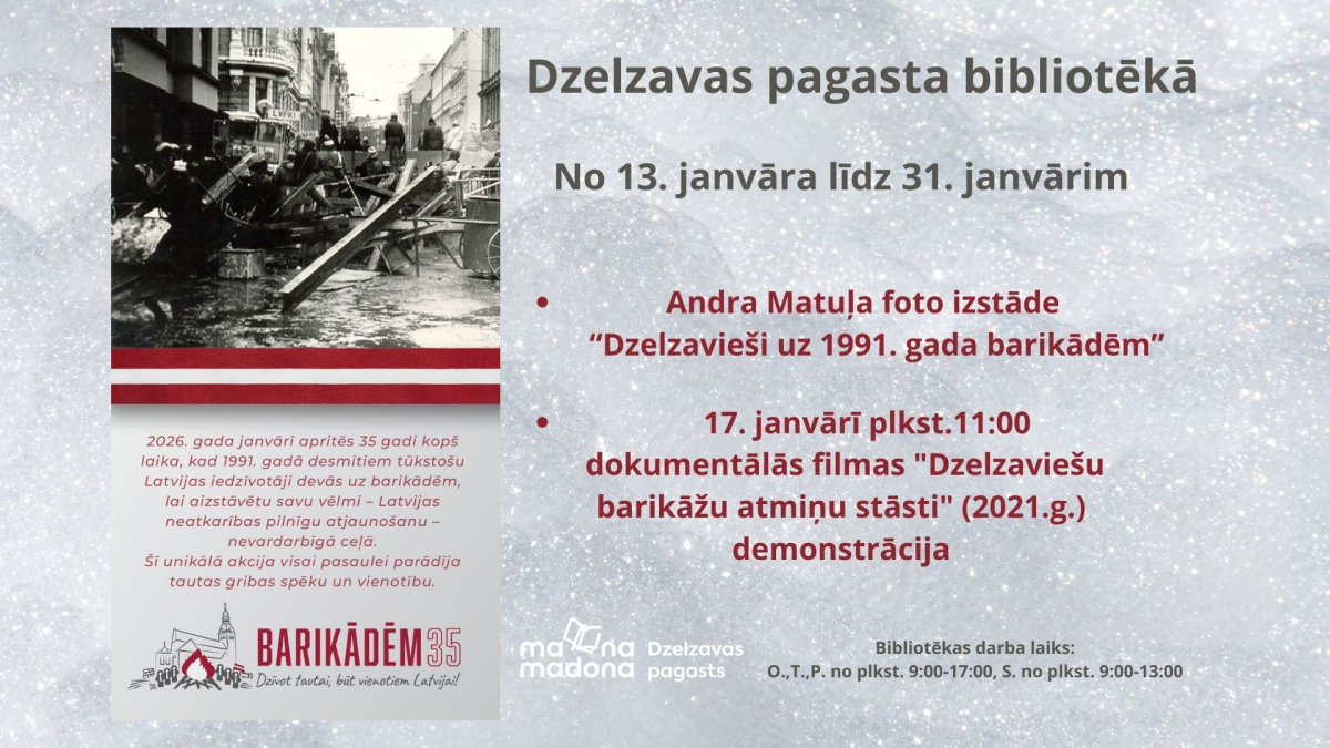17.janvārī plkst.11:00 tiks demonstrēta 2021. gadā uzņemtā dokumentālā filma ”Dzelzaviešu barikāžu atmiņu stāsti”.