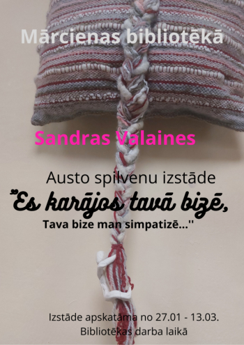 Mārcienas bibliotēkā skatāma mākslinieces Sandras Valaines austo spilvenu izstāde. Sandra ir ļoti daudzpusīga māksliniece, pasniedzēja Lubānas mākslas skolā. Glezno, auž gan no dabas materiāliem, gan citiem materiāliem. Mācījusies Latvijas Universitātē, ieguvusi kvalifikāciju “Profesionālais bakalaurs Vizuālās mākslas un mākslas vēstures skolotājs”. Mākslas skolā strādā kopš 1999. gada 1. septembra. Māca zīmēšanu, gleznošanu un veidošanu.