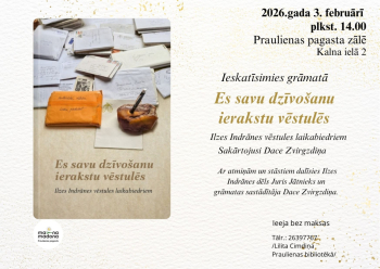 Praulienas pagasta bibliotēka sadarbībā ar Praulienas pamatskolu 3. februārī plkst. 14.10 Praulienas pagasta zālē, Kalna ielā 2 aicina ieskatīties Ilzes Indrānes vēstuļu krājumā “Es savu dzīvošanu ierakstu vēstulēs”.