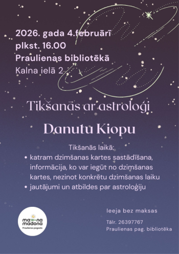 4. februārī plkst. 16.00 Praulienas pagasta bibliotēkā, Kalna ielā 2 laipni aicināti uz tikšanos ar astroloģi Danutu Kiopu.