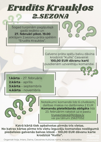 Erudīcijas maratona 2. sezonas 1. spēle 27.februārī. Turpinām iesākto un izceļam komandas dalībniekus, kuri nebaidās no izaicinājumiem. Spēle solās būt spraiga, jo katrs punkts var izšķirt tālāko virzību uz lielo finālu.
