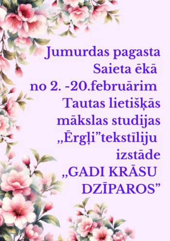 Jumurdas pagasta bibliotēkā, Jumurdas pagasta Saieta ēkā no 2.februāra līdz 20.februārim apskatāma Tautas lietišķās mākslas studijas “Ērgļi” tekstīliju izstāde "GADI KRĀSU DZĪPAROS". Izstādes apmeklētāji var priecāties par audēju un rokdarbnieču darbu skaistumu, krāsu košumu, rakstu daudzveidību kā apliecinājumu latviešu sievietes gara stiprumam caur paaudžu paaudzēm.