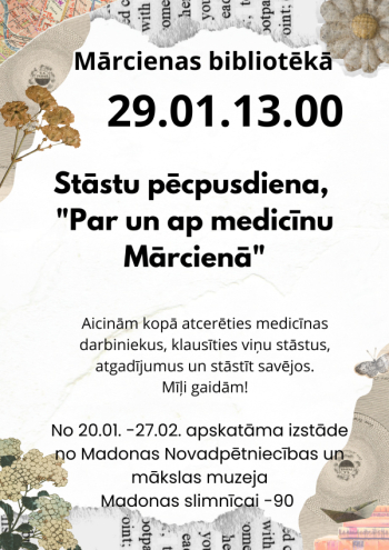 Mārcienas bibliotēkā no 20. janvāra apskatāma izstāde no Madonas novadpētniecības un mākslas muzeja krājuma, veltīta Madonas slimnīcas 90 gadei. 29.janvārī bibliotēkā aicināti piedalīties stāstu pasākumā par medicīnu Mārcienā.