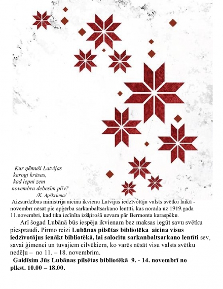 Arī šogad Lubānā būs iespēja ikvienam bez maksas iegūt savu svētku piespraudi. Pirmo reizi Lubānas pilsētas bibliotēka aicina visus iedzīvotājus ienākt bibliotēkā, lai salocītu sarkanbaltsarkano lentīti sev, savai ģimenei un tuvajiem cilvēkiem, ko varēs nēsāt visu valsts svētku nedēļu – no 11. – 18. novembrim.