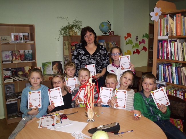 Senos laikos cilvēki, kad vēl nebija izgudrota elektrība, garajos un tumšajos ziemas vakaros pulcējās kopā, lai strādātu dažādus darbus( austu, adītu, gatavotu darba rīkus). Lai labāk veiktos darbi tika stāstītas pasakas, teikas, minētas mīklas. Apgaismojumu deva skala uguns. Tāpēc arī mūsu pasākums saucas “Pie skala uguns”. Bibliotekāre bērniem izdalīja sagatavotus skaliņus, kas “ jāaizdedzina”- pie skaliņa bija jāpiesien sarkana lentīte.