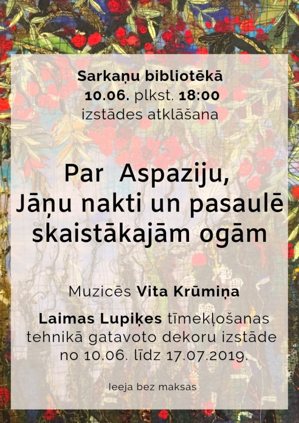 Ikviens apmeklētājs laipni aicināts 10.jūnijā pulksten 18:00 Sarkaņu bibliotēkā uz Tautas tēlotājas mākslas studijas „Madona” dalībnieces un mākslinieces Laimas Lupiķes dekoru izstādes “Par Aspaziju, Jāņu nakti un pasaulē skaistākajām ogām” atklāšanu.
