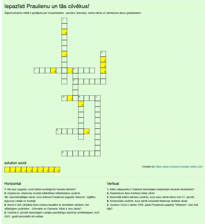 interesenti aicināti risināt krustvārdu mīklas par Praulienas pagastu un novadniekiem četrās kārtās. Noslēgumā pareizo atbilžu autori un aktīvākie saņems balvas.