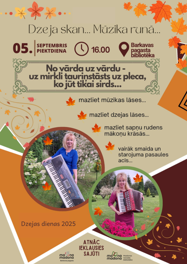 No vārda uz vārdu- uz mirkli tauriņstāsts uz pleca, ko jūt tikai sirds… Pasākumā skanēs dzeja un runās mūzika Mairitas Smelteres un Solvitas Vencjunas izpildījumā. Sajutīsim mazliet mūzikas lāses, mazliet dzejas lāses un mazliet sapņu rudens mākoņu krāsās. Atnāc, ieklausies un sajūti!