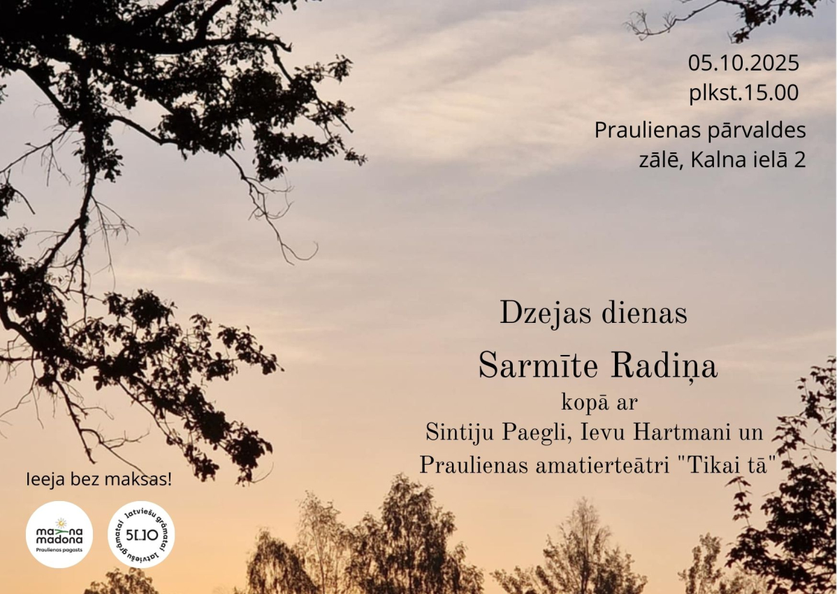 Laipni aicināti uz pasākumu, lai tuvāk iepazītu dzejnieci un viņas dzeju - gan Sarmītes, gan Praulienas amatierteātra “Tikai tā” dalībnieku izpildījumā. Par dziesmām un mūziku gādās Sintija Paegle un Ieva Hartmane.