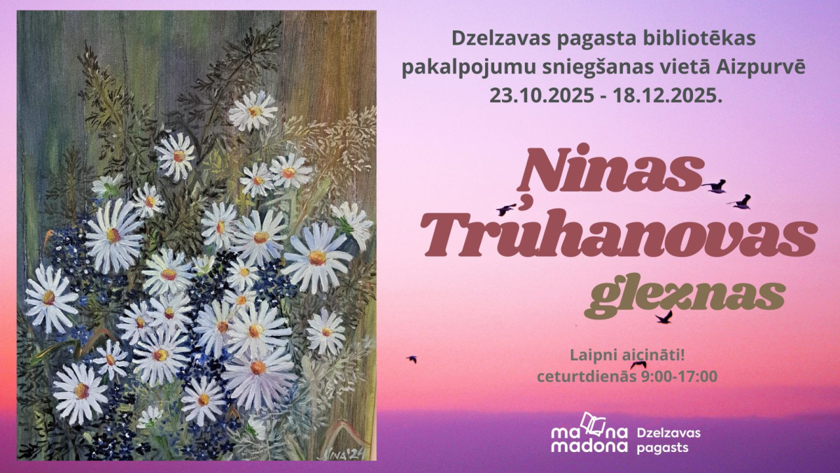 Dzelzavas pagasta bibliotēkas pakalpojumu sniegšanas vietā Aizpurvē no 30. oktobra līdz 18. decembrim apskatāma Cesvaines mākslas studijas dalībnieces Ņinas Truhanovas gleznu izstāde – lauku ainavas, ziedi.