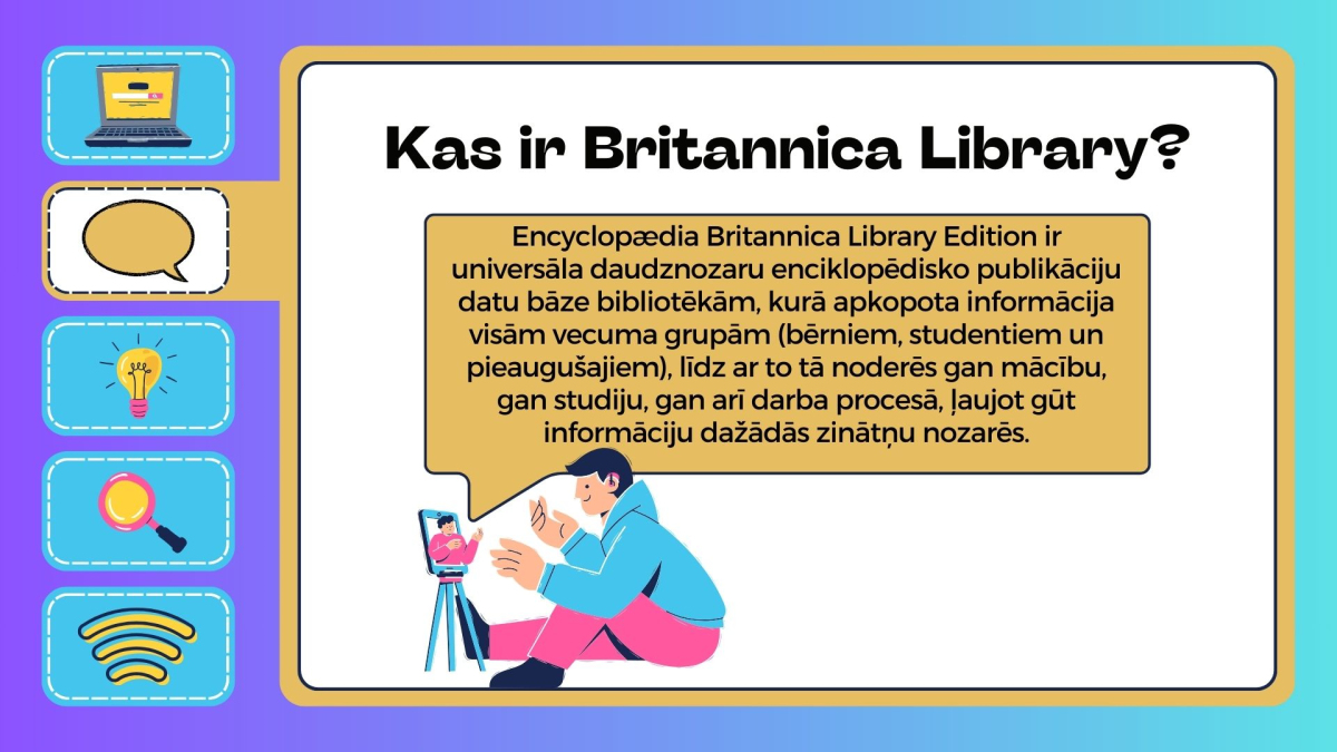ENCYCLOPÆDIA BRITANNICA LIBRARY EDITION ir universāla daudznozaru enciklopēdisko publikāciju datubāze bibliotēkām, kurā apkopota informācija visām vecuma grupām (bērniem, studentiem un pieaugušajiem), līdz ar to tā noderēs gan mācību, gan studiju, gan arī darba procesā, ļaujot gūt informāciju dažādās zinātņu nozarēs.
