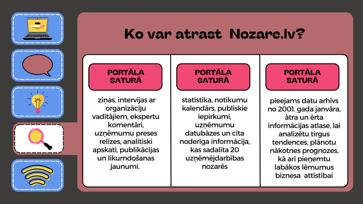 Nozare.lv katru dienu lasāmas ziņas, intervijas ar organizāciju vadītājiem, kā arī ekspertu komentāri, uzņēmumu preses relīzes, analītiski apskati, publikācijas un likumdošanas jaunumi. Te vienkopus apkopota statistika, notikumu kalendārs, publiskie iepirkumi, uzņēmumu datubāzes un cita noderīga informācija, kas sadalīta 20 uzņēmējdarbības nozarēs.