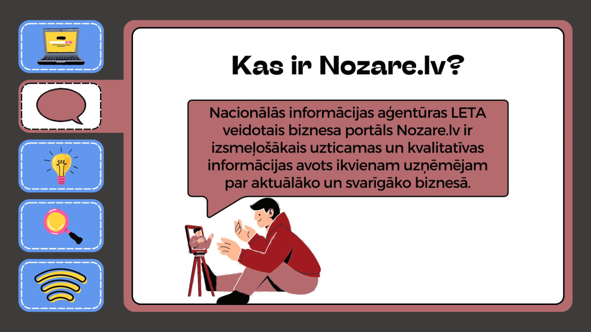 Nacionālās informācijas aģentūras LETA veidotais biznesa portāls Nozare.lv ir izsmeļošākais uzticamas un kvalitatīvas informācijas avots ikvienam uzņēmējam par aktuālāko un svarīgāko biznesā.
