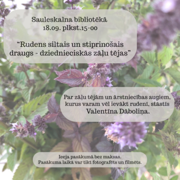 Sauleskalna bibliotēka 18. septembrī plkst.15-00 aicina uz pasākumu "Rudens siltais un stiprinošais draugs - dziednieciskās zāļu tējas".