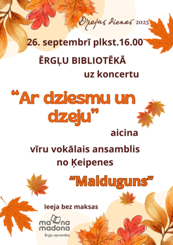 26. septembrī plkst. 16:00 Ērgļu bibliotēkā notiks muzikāls pasākums veltīts Dzejas dienām “Ar dziesmu un dzeju”.