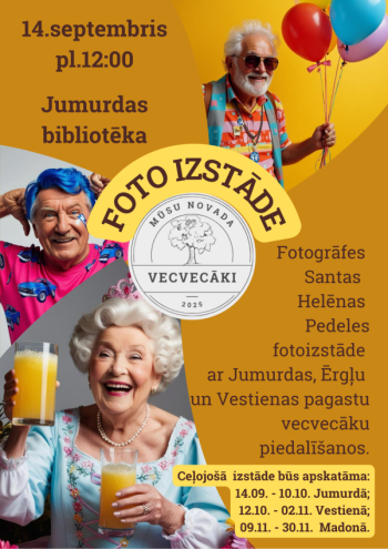 Jumurdas pagasta bibliotēka kopā ar radošo apvienību "Uzdrīksties” organizē fotogrāfiju izstādi "Mūsu novada vecvecāki”. Izstādi var apskatīt Jumurdas pagasta Saieta ēkā no 14. septembra līdz 10. oktobrim. Izstādē aplūkojamo fotogrāfiju autore ir fotogrāfe Santa Helēna Pedele. Izstādes fotogrāfijās caur prieku, humoru, stilistes Montas Masaļskas veidotajiem tēliem uz skatītāju raugās trīspadsmit Jumurdas, Vestienas un Ērgļu pagastos dzīvojoši vecvecāki. Izstādes virsmērķis ir popularizēt Vestienas, Ērgļu un Jumurdas pagastus, kā arī Madonas novadu kā jauku, prieka pilnu un mājīgu vietu ģimenēm līdz pat vecumdienām.