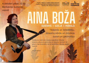 Barkavas pagasta bibliotēka 4.oktobrī plkst.12.30 aicina uz muzikālu tikšanos ar Ainu Božu, daudzpusīgu mākslinieci- dziedātāju, dziesmu vārdu un mūzikas autori un gleznotāju. Pasākums notiks Barkavas kultūras namā. Ieeja brīva.