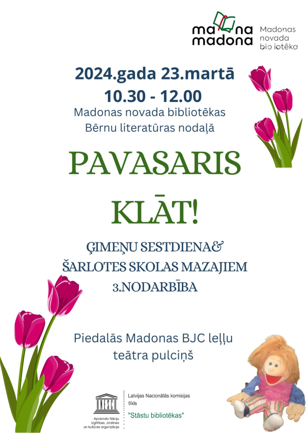 Kopīgi radoši darbosimies un uzzināsim ko jaunu. Aicinām ikvienu - gan ģimenes, gan draugus un ikkatru no jums arī pa vienam! Pasākuma īpašie viesi - Madonas BJC leļļu teātra pulciņš.