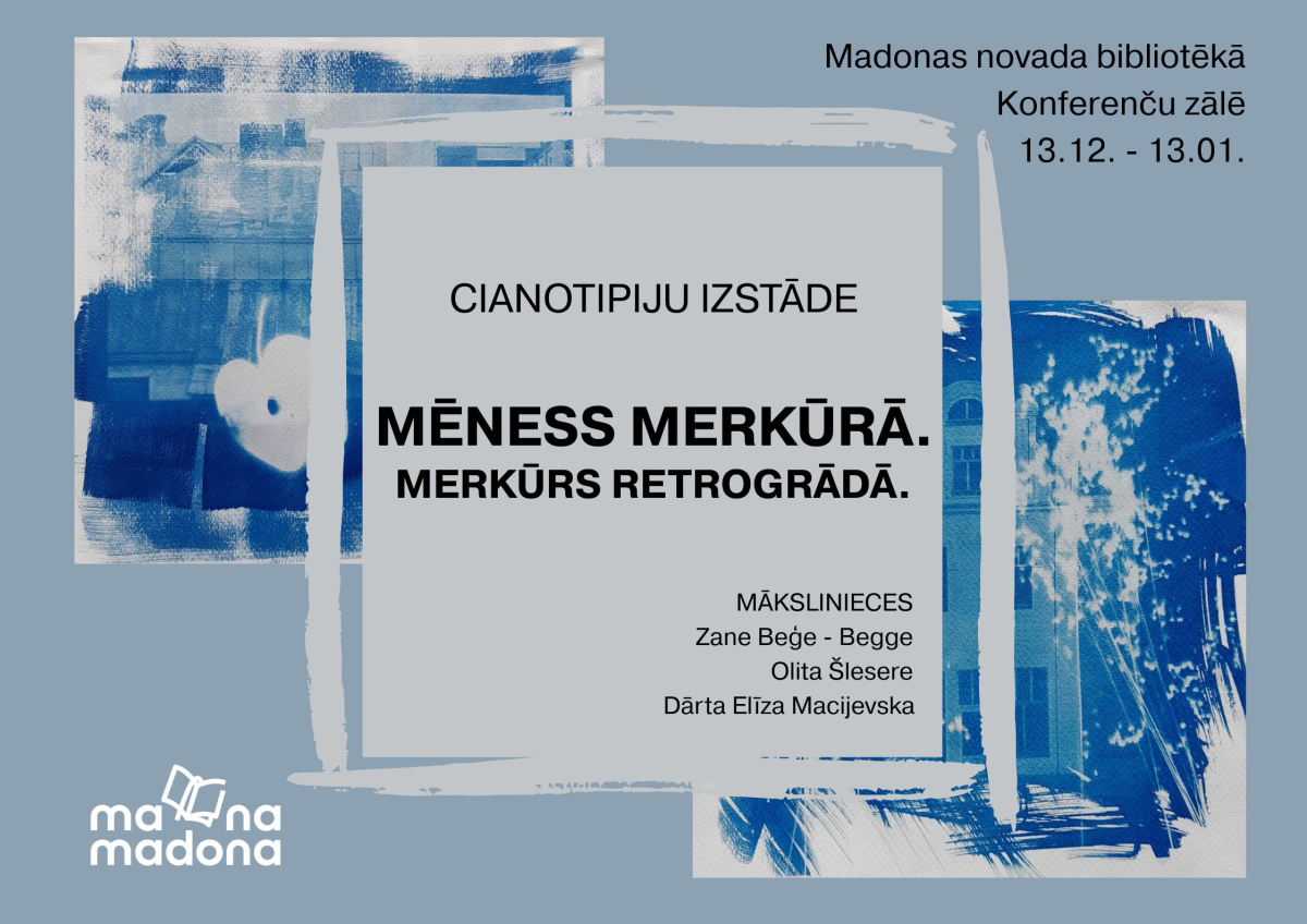 Aizbēdz no ikdienas steigas un ienirsti noslēpumainajā zilo toņu pasaulē! Izstāde “Mēness Merkūrā. Merkūrs retrogrādā” Madonas novada bibliotēkā aicina Tevi piedzīvot cianotipijas maģiju – gaismas, ēnu un nejaušības radītus attēlus, kuros sastopas sapņi un realitāte.