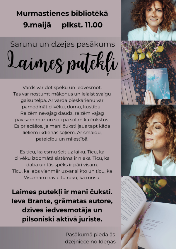 9.maijā plkst. 11.00 aicināti uz sarunu un dzejas pasākumu “Laimes putekļi” kopā ar Ievu Branti.
