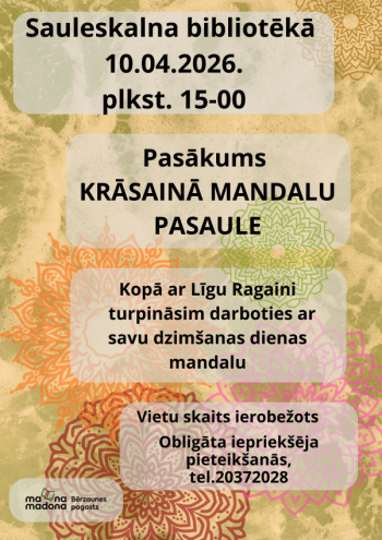 Piektdien, 10. aprīlī, plkst. 15:00 Sauleskalna bibliotēkā Līga Ragaine turpinās stāstīt par dzimšanas dienas mandalu.