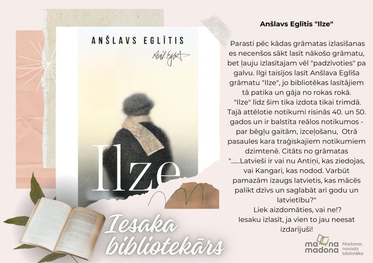 Parasti pēc kādas grāmatas izlasīšanas es necenšos sākt lasīt nākošo grāmatu, bet ļauju izlasītajam vēl "padzīvoties" pa galvu. Ilgi taisījos lasīt Anšlava Eglīša grāmatu "Ilze", jo bibliotēkas lasītājiem tā patika un gāja no rokas rokā.