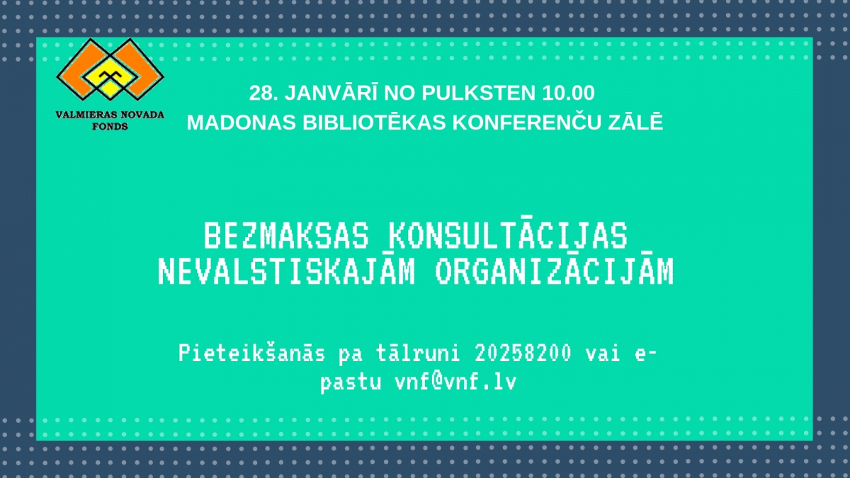 Izbraukuma konsultācijas vēl notiks 30. janvārī Cēsīs. Pateicoties Kultūras ministrijas atbalstam, Valmieras novada fonds individuālās konsultācijas nodrošina bez maksas jebkurai biedrībai un nodibinājumam Vidzemē. Vairāk informācijas mājas lapā www.vnf.lv sadaļā “Aktuāli”.