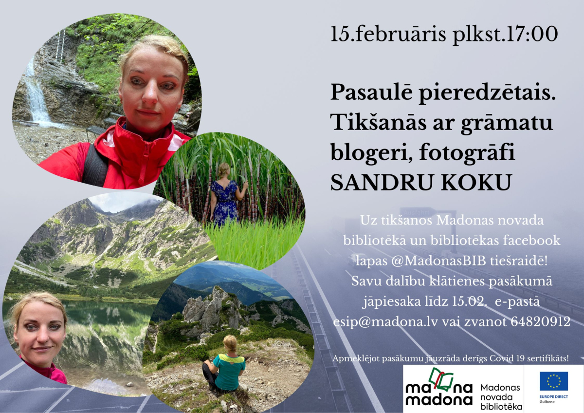 15.februārī plkst.17.00 pasākums “Pasaulē pieredzētais”. Tikšanās ar grāmatu blogeri, fotogrāfi Sandru Koku. Pasākums notiks gan klātienē, gan Madonas novada bibliotēkas Facebook tiešraidē. Klātienes apmeklējums, uzrādot derīgu Covid 19 sertifikātu, iepriekš piesakot savu dalību, līdz 15.februārim e-pastā: esip@madona.lv vai zvanot 64820912