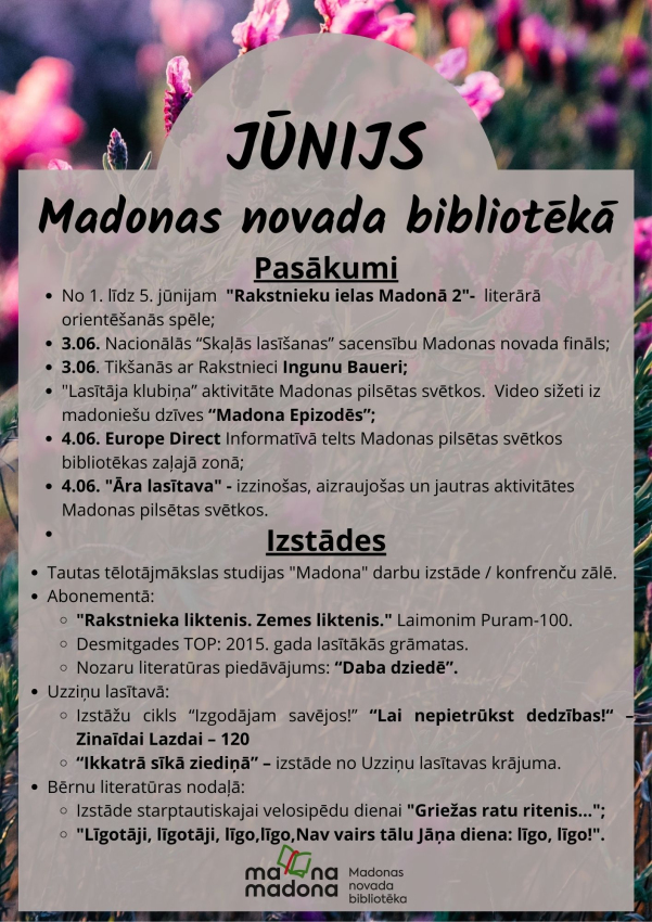 Pasākumi un izstādes jūnijā Madonas novada bibliotēkā.
