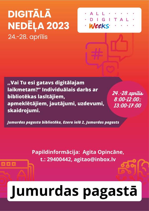 Jumurdas pagasta bibliotēkā (Ezera ielā 2, Jumurdas pagasts) 24.-28.aprīlī visas darba diena garumā notiks individuālais darbs ar bibliotēkas lasītājiem, apmeklētājiem, jautājumi, uzdevumi, skaidrojumi “Vai Tu esi gatavs digitālajam laikmetam?”. Kontaktpersona: Agita Opincāne, t.: 29400442, e-pasts: agitao@inbox.lv.