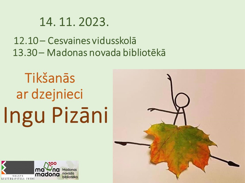 14. novembrī 13.30 Madonas novada bibliotēkā aicinām apmeklēt tikšanos ar Ingu Pizāni. Autore dzīvo Rīgā, raksta dzeju un prozu, aizraujas ar fotogrāfiju, meditāciju un kino. Publicējusies latviešu un ārzemju literāros izdevumos. Izdotas grāmatas: Tu neesi sniegs [dzeja], Rīga: Jāņa Rozes apgāds, 2016.; Having Never Met [dzeja], Ņujorka: A Midsummer Night's Press, 2018.; Siena, ko nosiltināt [dzeja], Rīga: Jāņa Rozes apgāds, 2019.; Tas pats izmisums, tikai ar puķēm [dzeja], Rīga: Jāņa Rozes apgāds, 2022. Tapušas video dzejoļu un foto sērijas.