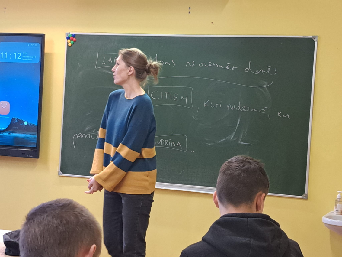 Veselas divas mācību stundas kopā ar Lauru bija 19 skolēni ar savu skolotāju Vitu Priedi un direktori Sarmīti Kukāri – Vorslovu. Tika uzdoti vairāki radoši uzdevumi, piemēram, radīt dzejoli ar noteiktu zilbju skaitu, veidot vārdu kolāžu, tad no tiem izveidot teikumu. Īpaši aktīvi bija 7.klases zēni Henrijs, Aksels, Ričards un Daniels, kuri pat sacentās viens ar otru, lai varētu izlasīt savus piemērus.