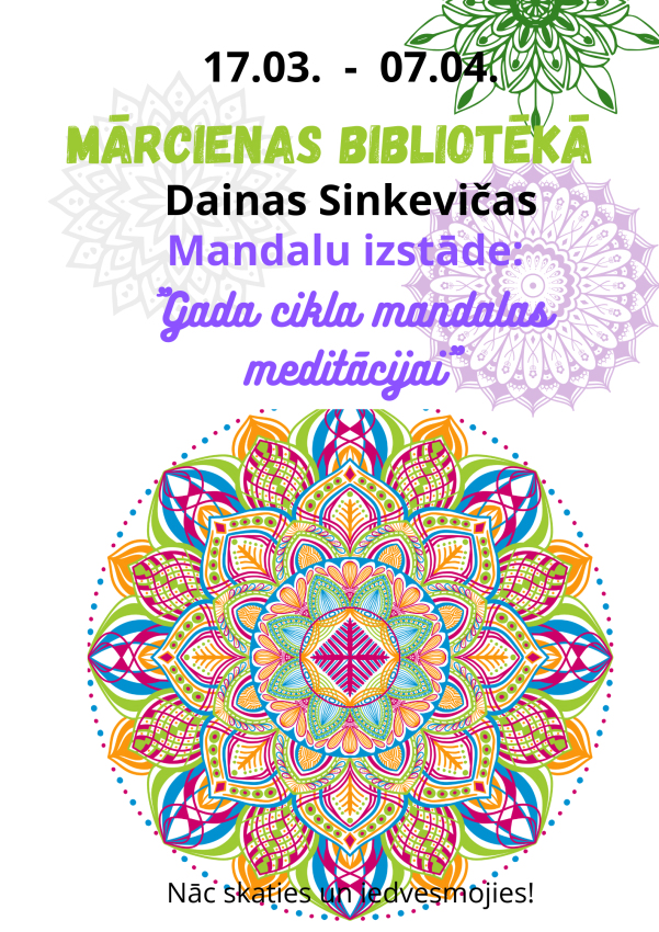Bibliotēkā izvietotas divpadsmit mēnešu gada dabas mandalas. Gada katram mēnesim ir sava noskaņa, sajūta un darbi, kas tajā rit raitāk. Aicinām apmeklēt izstādi un ieskatīties dabas mandalās un sajust, kura visvairāk atsaucas. Mandalu esejas katram mēnesim ir skatījums mākslinieces gada griezumā.