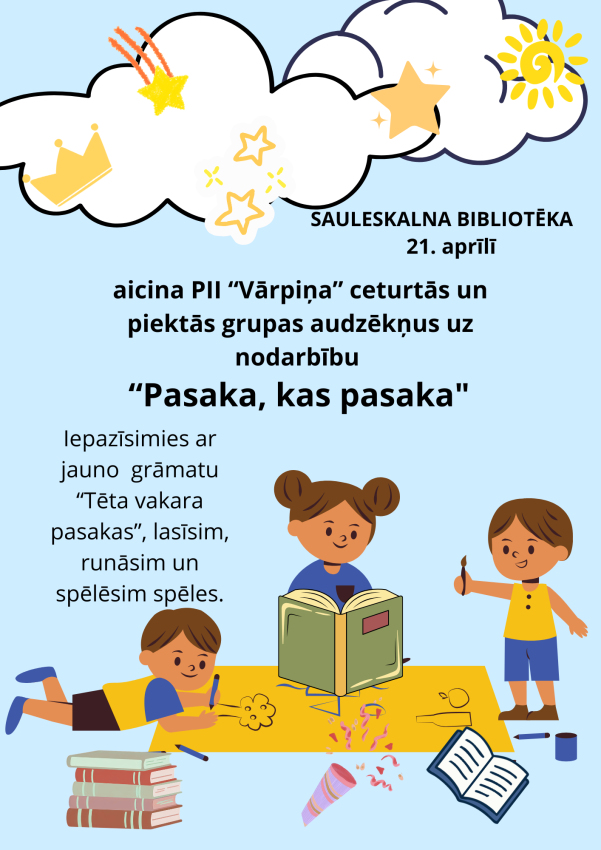 Sauleskalnā pasākums PII Vārpiņa vecāko grupu bērniem "Pasaka, kas pasaka" - iepazīšanās ar jauno Gunta Eņģeļa bērnu grāmatu "Tēta vakara pasakas,  lielformāta spēles spēlēšana.