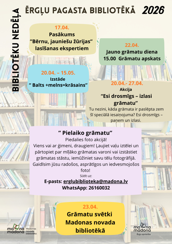 “Pielaiko grāmatu!” Aicinām ikvienu – individuāli, kopā ar ģimeni vai draugiem – piedalīties foto akcijā! Ļaujiet vaļu iztēlei un, izmantojot pārģērbšanos,  aksesuārus vai citādas radošas aktivitātes, pārtopiet par savu mīļāko grāmatas varoni vai izstāstiet stāstu par kādu grāmatu, iemūžiniet savu tēlu fotogrāfijā un dalieties ar grāmatu mīlestību kopā ar mums!📸 Gaidīsim jūsu radošos, asprātīgos un iedvesmojošos foto!  Sūtīt uz: E-pasts: erglubiblioteka@madona.lv WhatsApp:  26160032