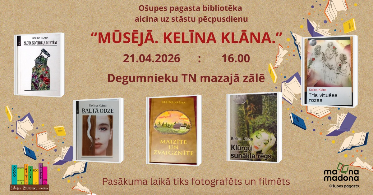 Bibliotēku nedēļas ietvaros rakstnieces Kelīnas Klānas jeb skolotājas, sabiedriskās darbinieces Elīnas Koļesņikovas līdzgaitnieki, kaimiņi, bijušie kolēģi tiek aicināti pakavēties atmiņās par viņu. Atmiņu stāsti tiks izmantoti K.Klānas jubilejas pasākumā šī gada augustā.