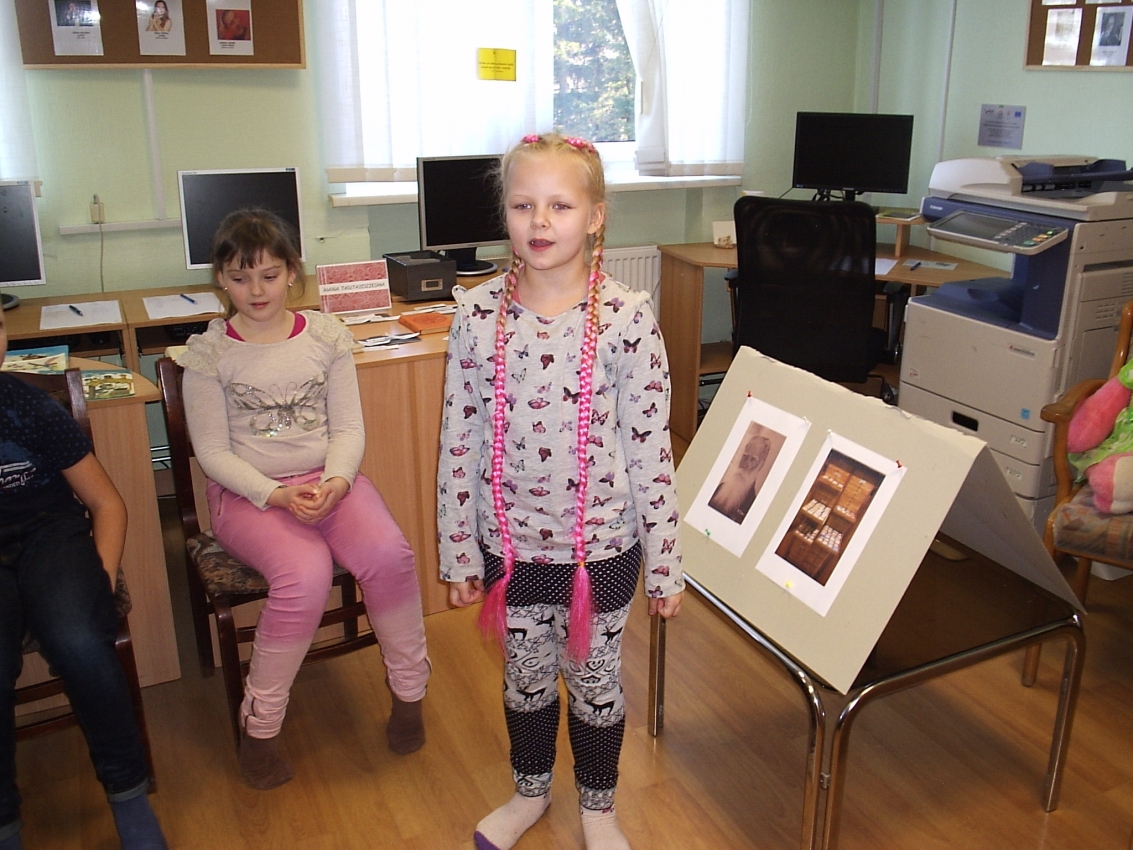 Latvijas simtgadi bibliotēkā svinējām kopā ar 2.klases skolēniem. Latvija un tautasdziesma – tie ir nesaraujami saistīti vārdi, jo dainās taču ir visa latviešu tautas dzīve. Bērnu veltījums Latvijai bija viņu izvēlētas un ilustrētas tautasdziesmas. Pasākums sākās ar bibliotekāres stāstījumu par Krišjāni Baronu un dainu skapi. Bērni uzzināja arī to, kā dainas dalās pa tēmām. Arī mums bija pajukušas dažas lapiņas ar tautasdziesmām, kurām vajadzēja atrast savu īsto vietiņu, un pie viena arī noklausīties, kā tās skan. Kad uzdevums bija izpildīts, skolēni skaitīja savas izvēlētas dainas. Tas bija ļoti sirsnīgi! Vēl viens uzdevums bija – jāatšifrē, kāda tautasdziesma slēpjas zem bilžu simboliem. Kad uzdevums bija paveikts, visus iepriecināja svētku kliņģeris. Bibliotekāre ciemiņiem dāvināja Latvijas simbolu – karodziņu kastanī. Tika izveidota skolēnu ilustrēto tautasdziesmu izstāde.