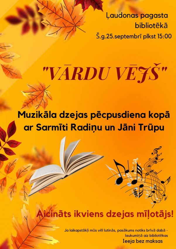 Šā gada 25.septembrī plkst.15:00 Ļaudonas pagasta bibliotēka aicina uz muzikālu dzejas pēcpusdienu “VĀRDU VĒJŠ”, kopā ar mūsu novadnieci dzejnieci Sarmīti Radiņu un mūziķi Jāni Trūpu.