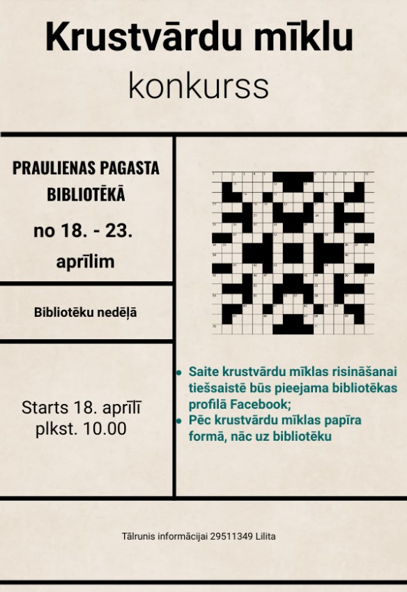 Praulienas bibliotēka Bibliotēku nedēļā no 18. līdz 23. aprīlim aicina uz krustvārdu mīklu konkursu.