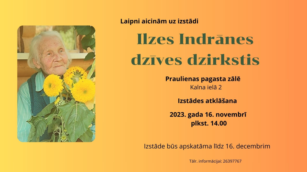 Praulienas pagasta bibliotēka aicina uz izstādes "Ilzes Indrānes dzīves dzirkstis" atklāšanu Praulienas pagasta zālē Kalna ielā 2 2023. gada 16. novembrī plkst. 14.00